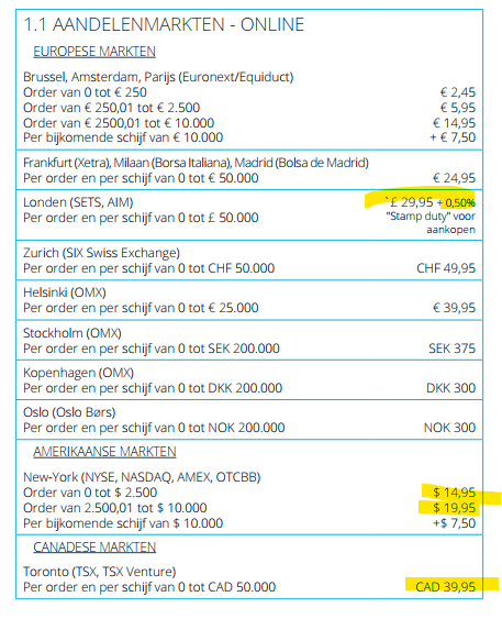 €25 per transactie in Londen en Canada, €30 per transactie in Hongkong, Italië of Singapore… dat is duur (zoals bij Keytrade).