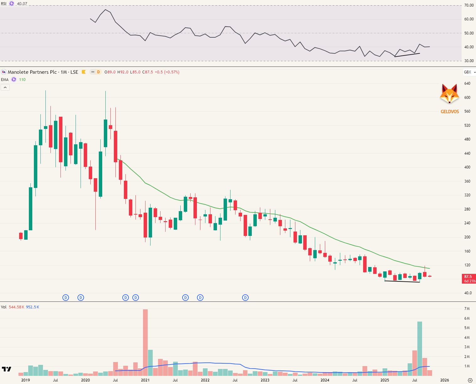 In het geval van Manolete Partners is dat niet meer zo. De instap werd gemaakt op basis van de weekgrafiek en dat blijkt niet de belangrijkste tijdshorizon. Fundamenteel blijft het bedrijf gezond met een beloftevolle toekomst, maar technisch is de vraag op welke tijdshorizon de grafiek richting kan bieden.