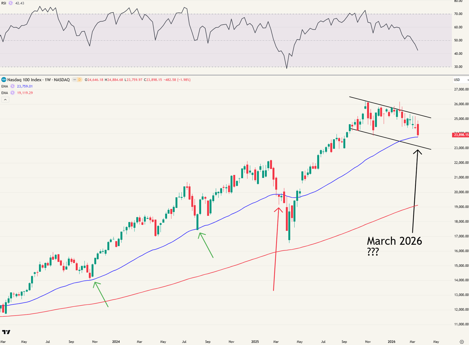 In maart 2025 sloot de koers 2x op rij onder de bollinger band. Een herhaling daarvan (= deze week slot onder bollinger) is uiteraard bearish. Dat zou samenvallen met een slot onder de EMA 50 en dan kan ik niet meer bullish gestemd blijven op de Nasdaq.