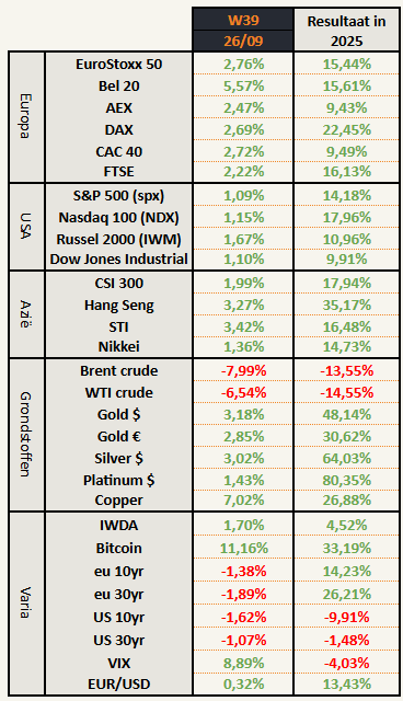 Ik val in herhaling, maar elke week moet ik opnieuw zeggen: de markten blijven sterk presteren. Zowel de Europese, Amerikaanse als Aziatische aandelenindexen staan mooi in het groen.