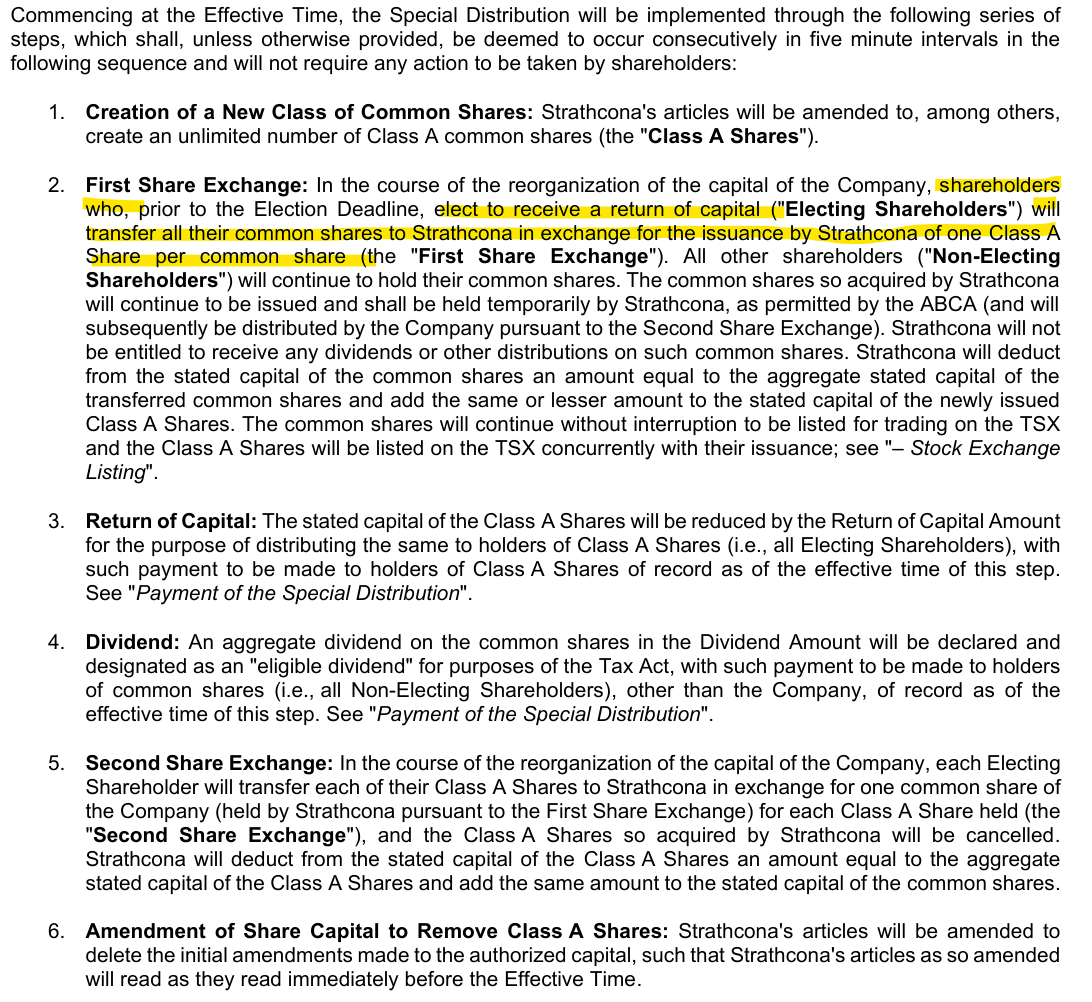 Er wordt een speciaal dividend uitgekeerd van C$10 per aandeel. Daarbij heb je de keuze om het te ontvangen als dividend of als kapitaalsvermindering. Normaliter is een uitkering als kapitaalsvermindering vrij van belastingen in België. Echter in deze situatie is het niet vrij van belasting door de procedure die Strathcona Resources toepast.