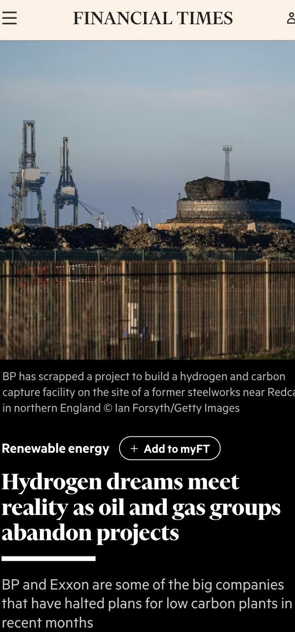 Dat waterstofprojecten massaal in de koelkast worden gezet, is geen verrassing. Dat schreef ik al in december 2022 en juli 2024. Het rekent gewoon niet. Je moet er meer energie in investeren dan je eruit haalt. Dan stop het snel.